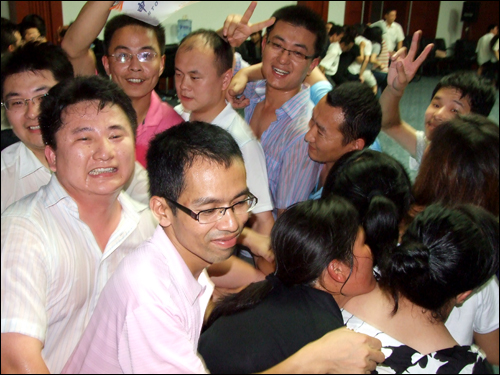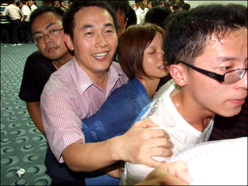 在講到“泛愛眾”這個章節(jié)時,任老師與大家分享了一個“同甘共苦”的互動游戲,他把現(xiàn)場人員分為12個組,每隊12至15人不等,大家并排站好,拼成一個緊湊的圓圈,每個隊員依次坐在后一位隊員的腿上,哪隊堅持的時間長哪隊就獲勝。開始時大家還感覺很輕松,隨著時間一分一秒的過去,疼痛感漸漸襲來,大家開始感覺體力不支,這時會議室的空調(diào)也停止運轉(zhuǎn),七月的濟南,正是最熱的時候,不一會兒,大家就大汗淋漓。