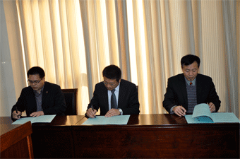 簽訂監(jiān)管承諾書 杜經(jīng)理與其他兩位公司代表上臺(tái)領(lǐng)取獎(jiǎng)牌