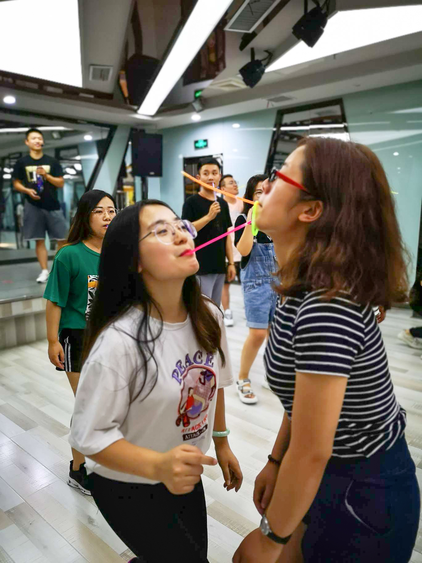 每個人用嘴咬著一根塑料棍,傳遞同心圓,用時最短傳遞到終點(diǎn)的隊伍勝利,這個考驗(yàn)了大家的團(tuán)隊協(xié)作能力,傳遞過程中千姿百態(tài),笑料百出。