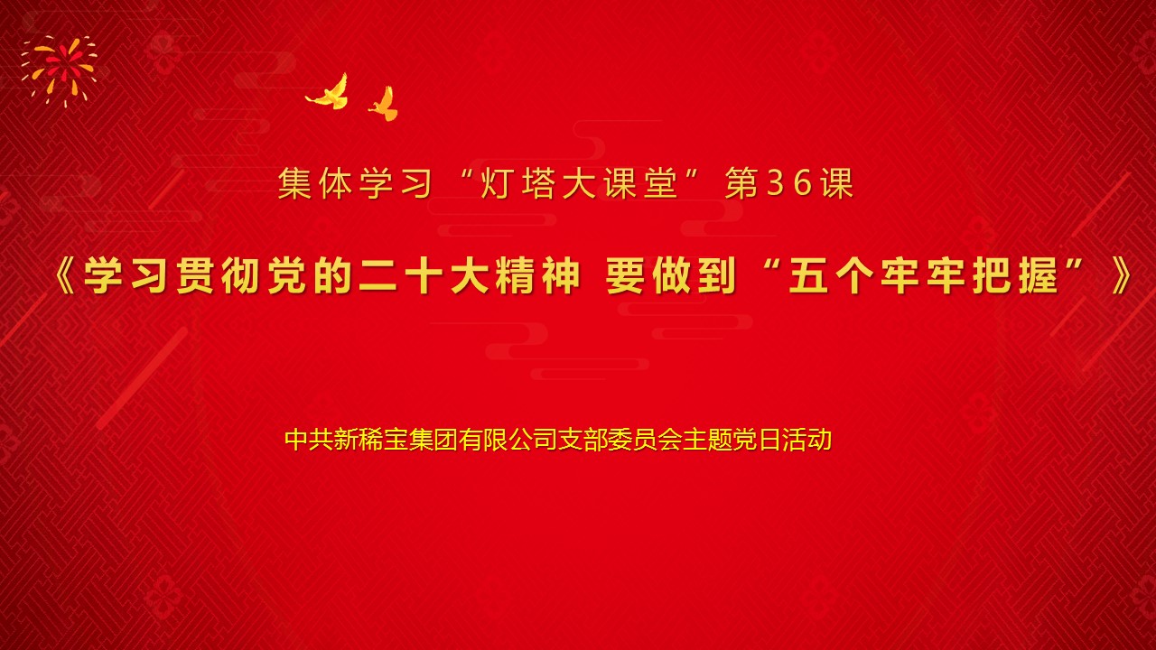 11月17日下午,新稀寶黨支部組織學(xué)習(xí)“燈塔大課堂”第36課《學(xué)習(xí)貫徹黨的二十大精神,要做到“五個(gè)牢牢把握”》。本次學(xué)習(xí)由集團(tuán)黨支部書記鄭朝霞主持,參加學(xué)習(xí)的有支部組織委員于鳳仙,支部黨員、預(yù)備黨員、入黨積極分子和部分群眾代表。